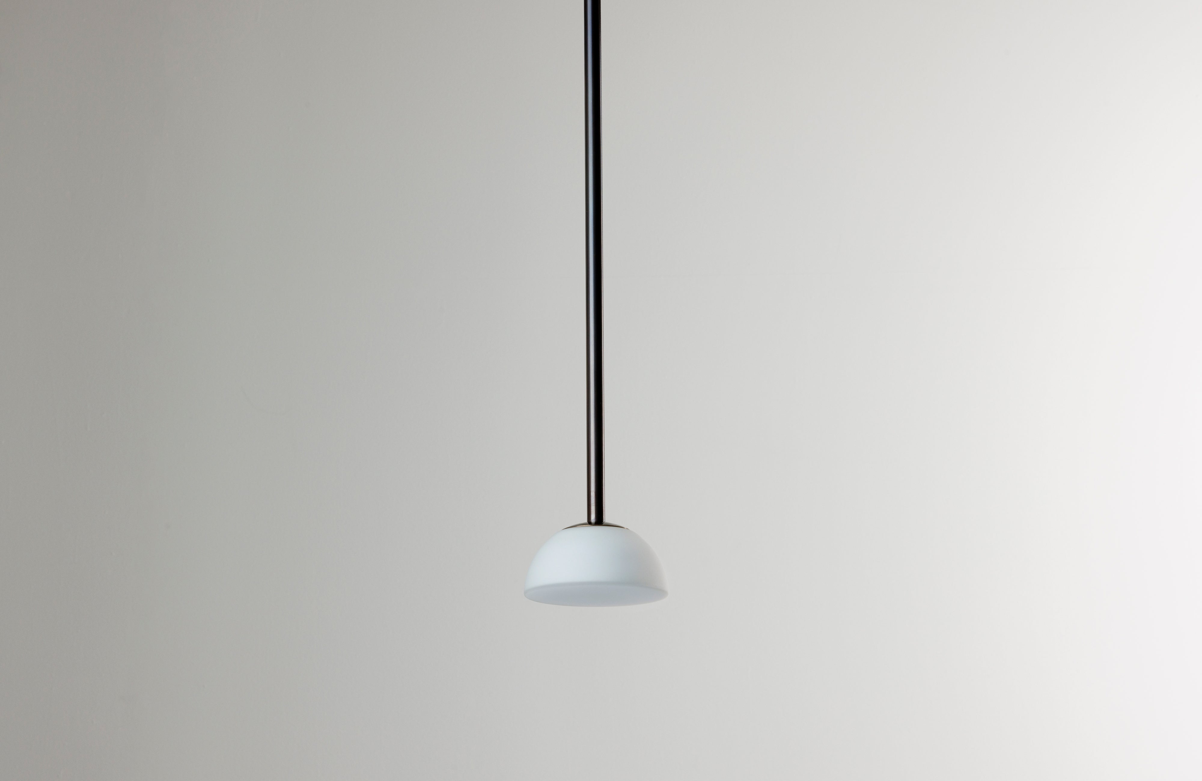 A study in simplicity, the So Pendant pairs custom-made glass with hand-finished brass components, its defining hemisphere globe casting a soft, ambient glow.