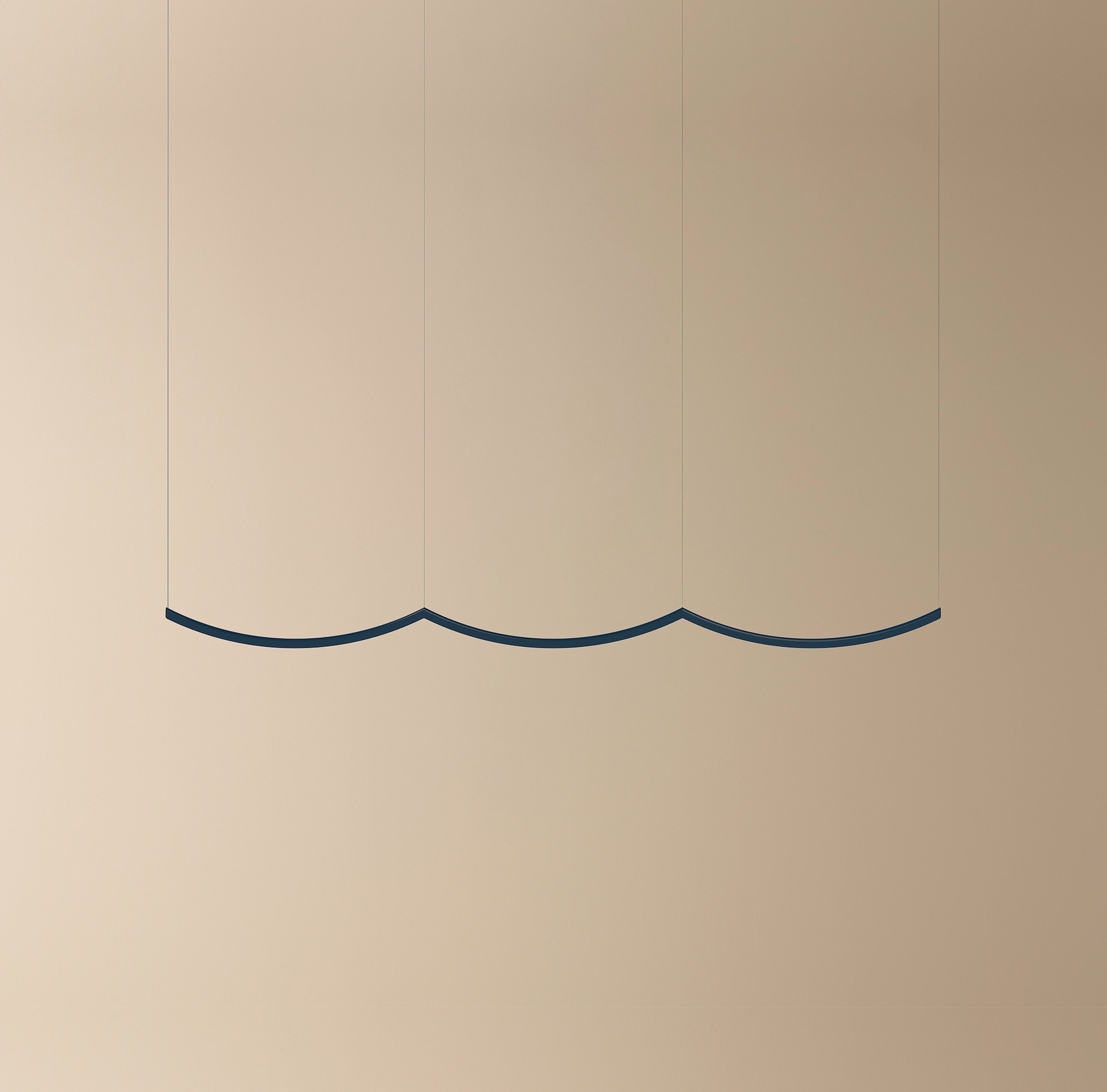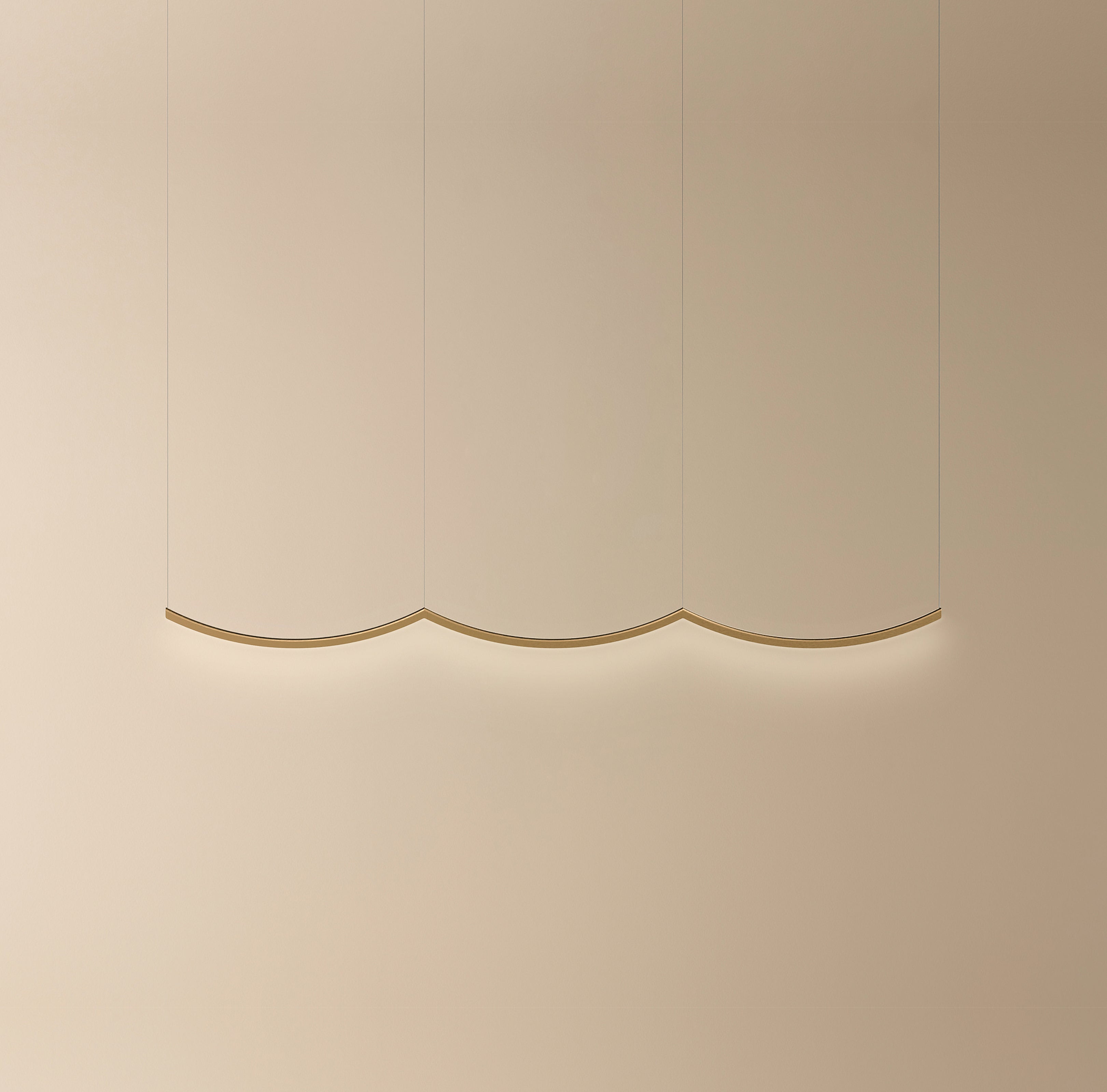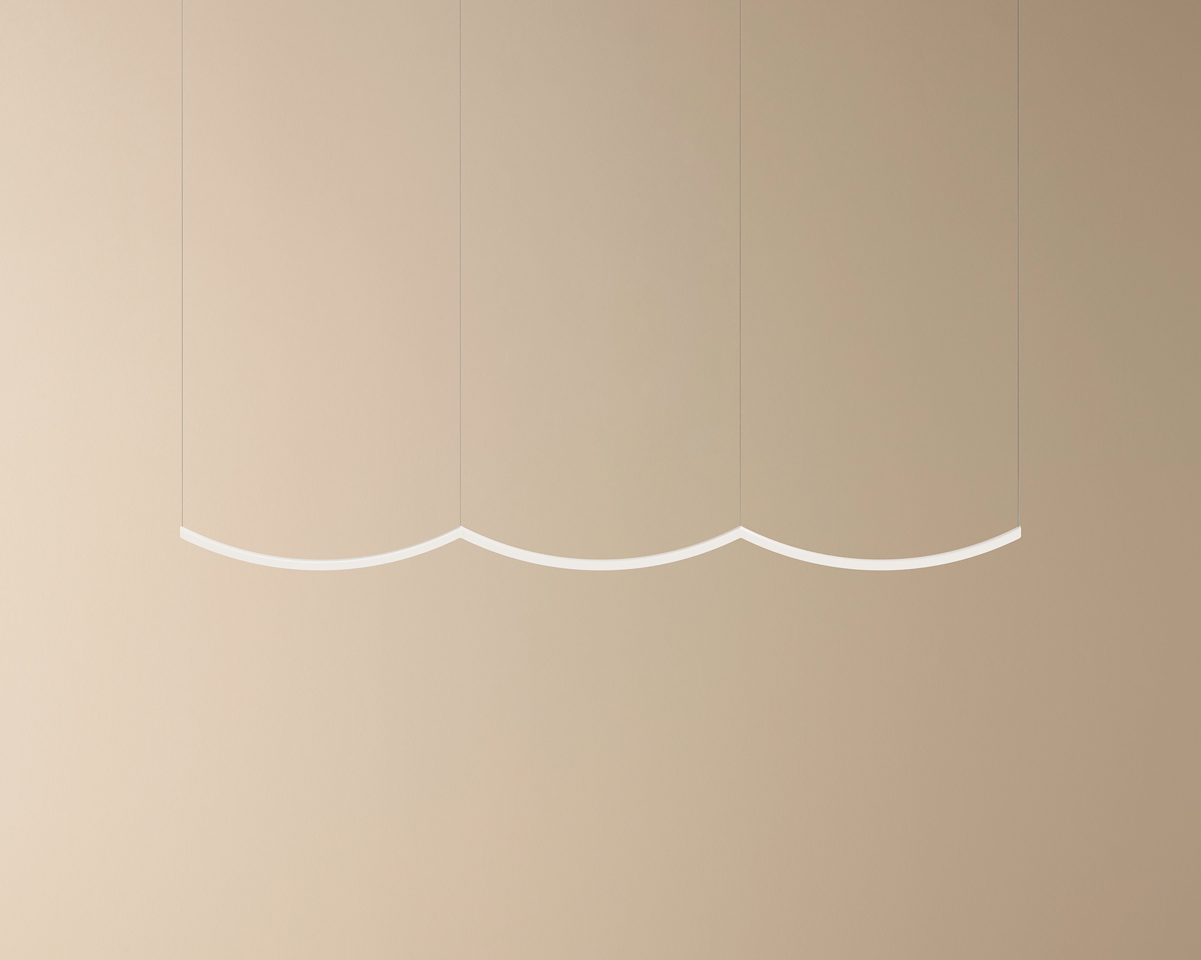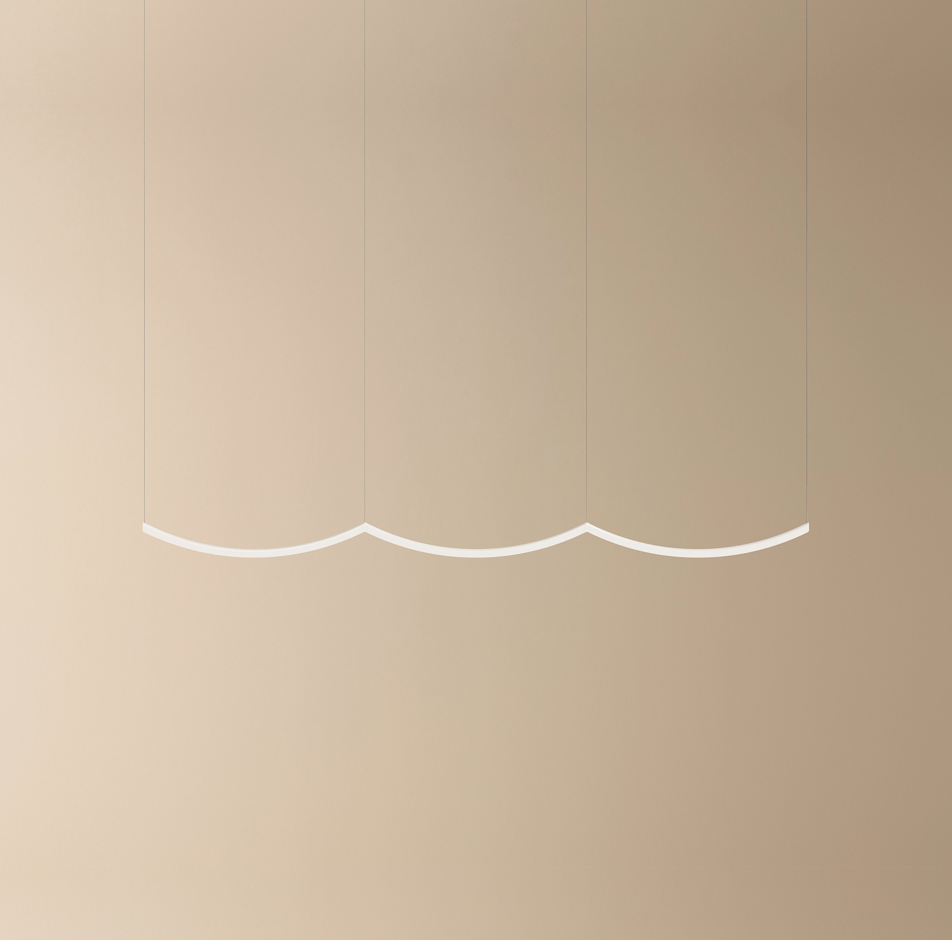 Available in single, double, and triple curve configurations, each additional module enhances the undulating effect. The clean exterior conceals a sophisticated electrical system, allowing seamless connectivity between modules, while the dimmable LED produces a soft, diffused glow.