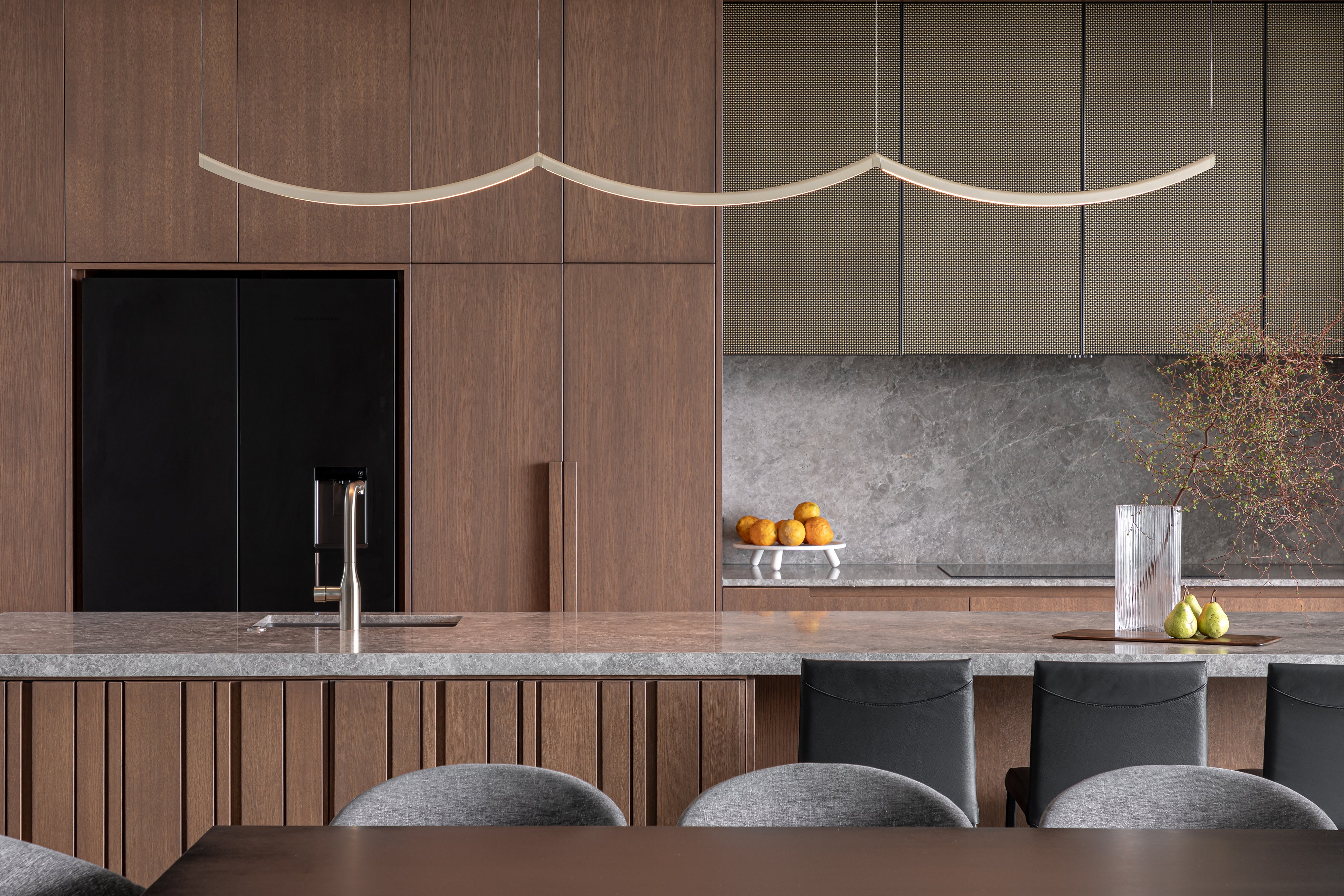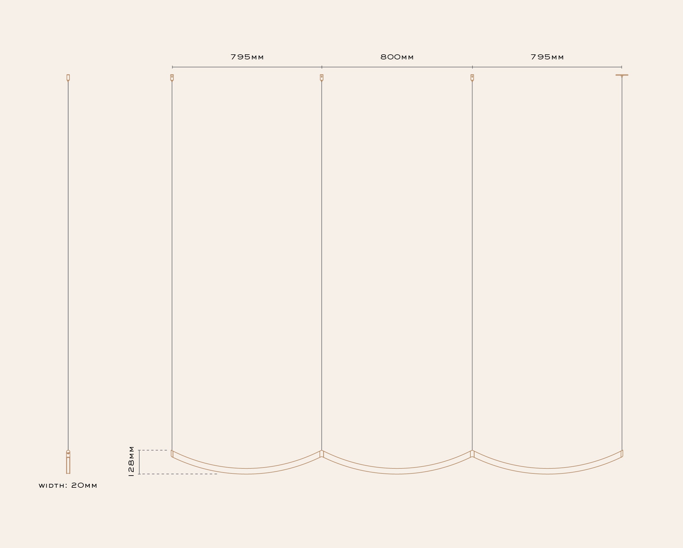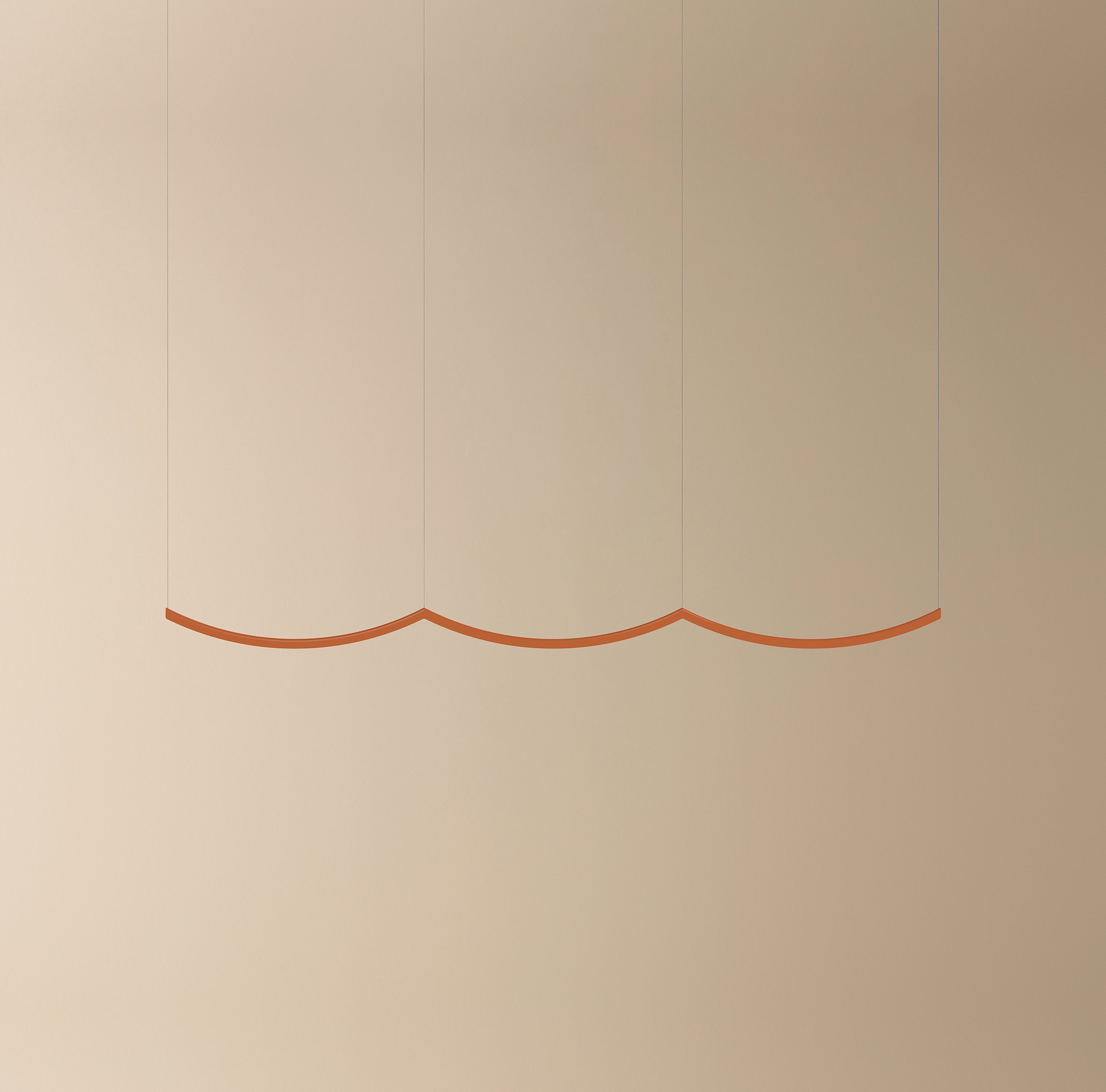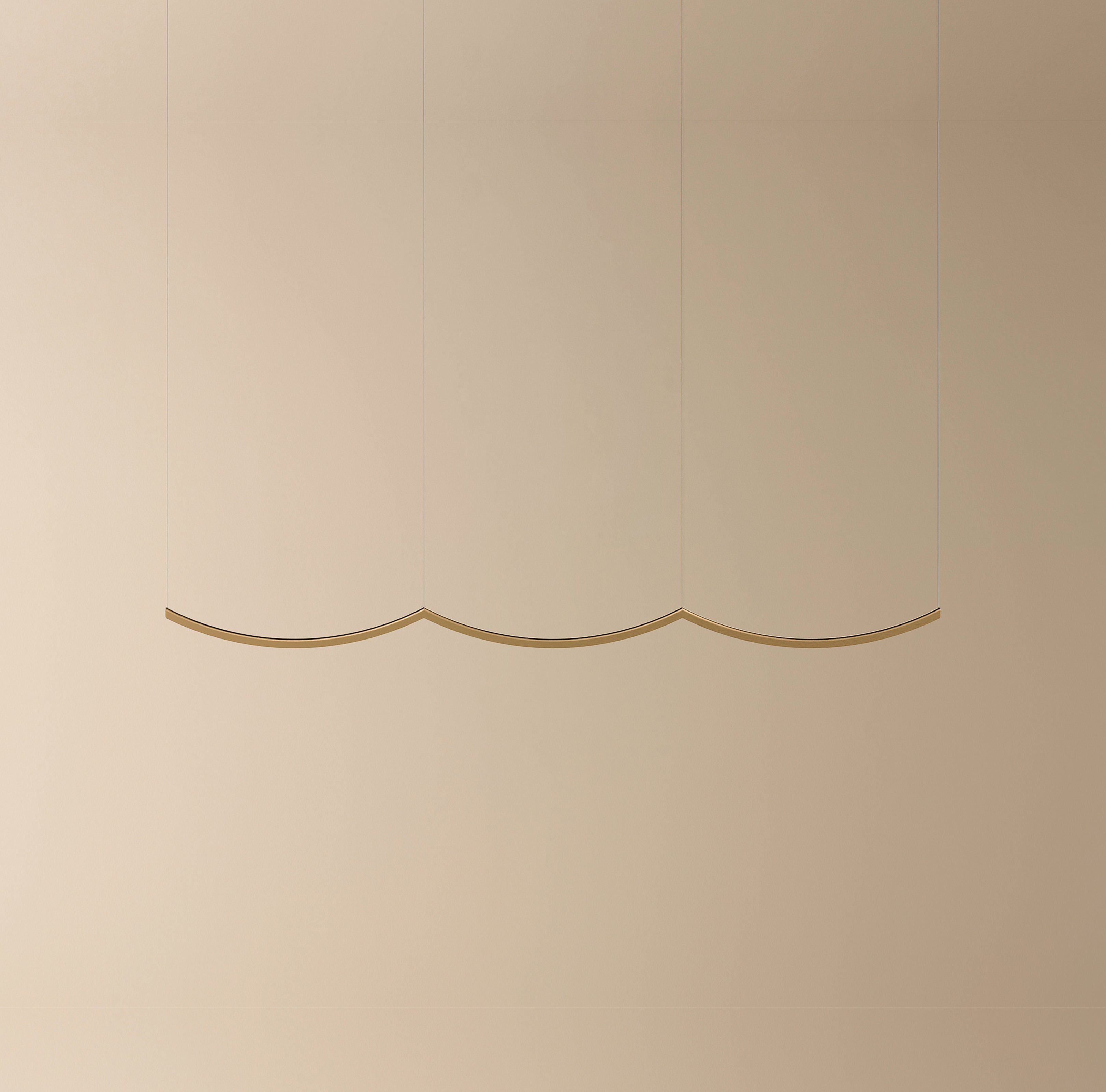 Available in single, double, and triple curve configurations, each additional module enhances the undulating effect. The clean exterior conceals a sophisticated electrical system, allowing seamless connectivity between modules, while the dimmable LED produces a soft, diffused glow.