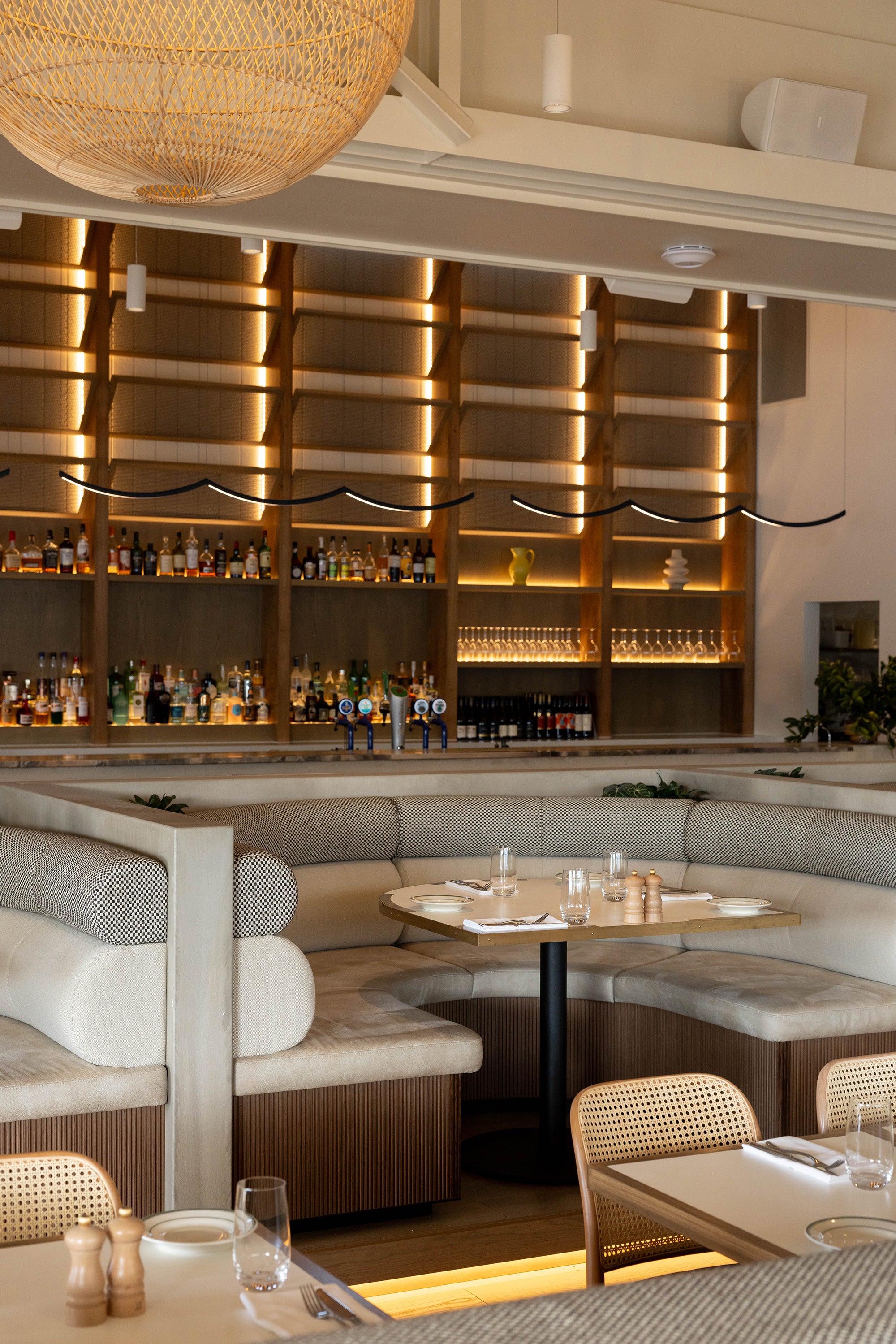 Suspended above the bar in a deep Navy finish, our Tasman Triple Pendants echo the marina’s calm, anchoring the space with sculptural rhythm and understated elegance.